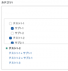 「タイトル」フィールドに「カテゴリセットテスト」を入力し、「カテゴリ1」で「テスト1-2」を選択していたとすると、下記のように出力されることになります。